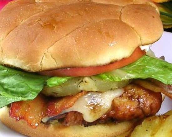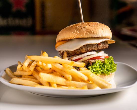 lamb and beef patty, bacon and egg/ lettuce tomato and onion with melted cheese served with fries.