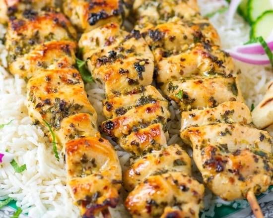 Greek Chicken Skewers with Tzatziki Sauce on a bed of rice, served wit...