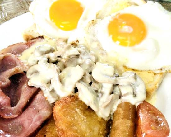 Bacon, free range 2 fried eggs, Toast, hash browns and sausages and Mushrooms . Make sure you are hungry when ordering this dish.