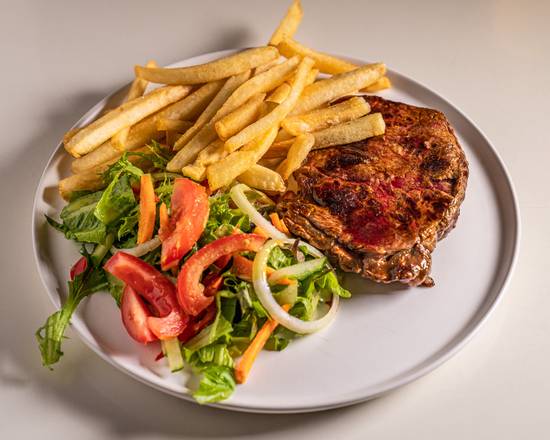 280grams aged NZ Scotch Fillet served with fries and salad and a beautiful steak Sauce.