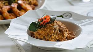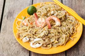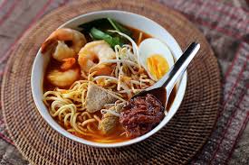 Yellow egg noodles and vermicelli with rich and creamy coconut milk, prawns, fish ball, fish cake, crab nuggets, fried tofu, bean sprouts, and spring onions.