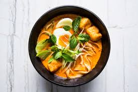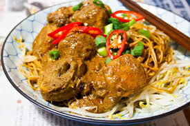 Yellow noodles and vermicelli with rich and creamy coconut milk, steam chicken, fried tofu, bean sprouts, and spring onions.