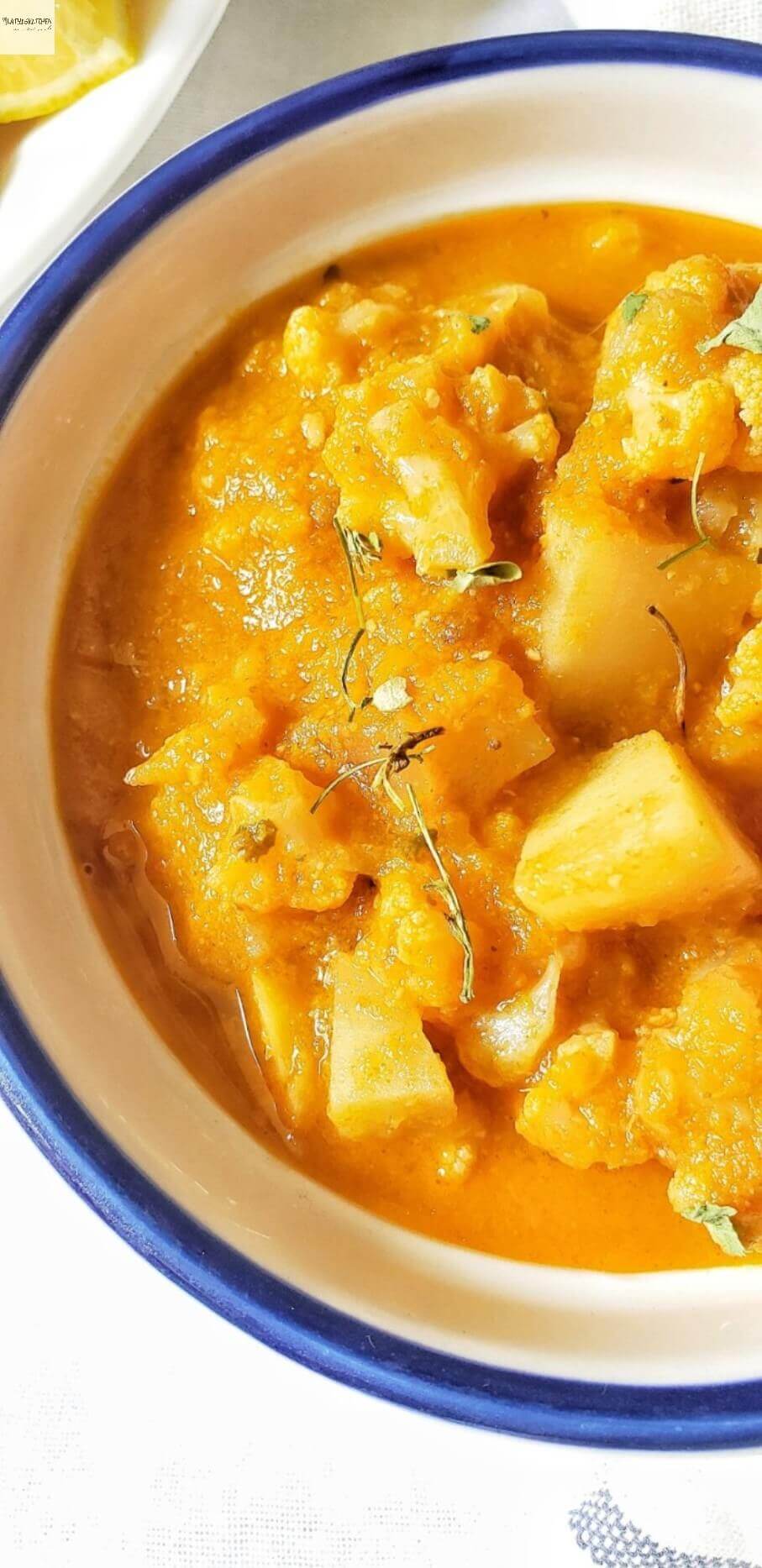 Cauliflower and potatoes cooked in exotic spicy sauce wtih tomatoes and ginger