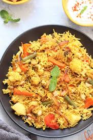 Mughalai style basmati rice slow cooked with onions, coriander and spices with vegetables and served with raita