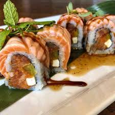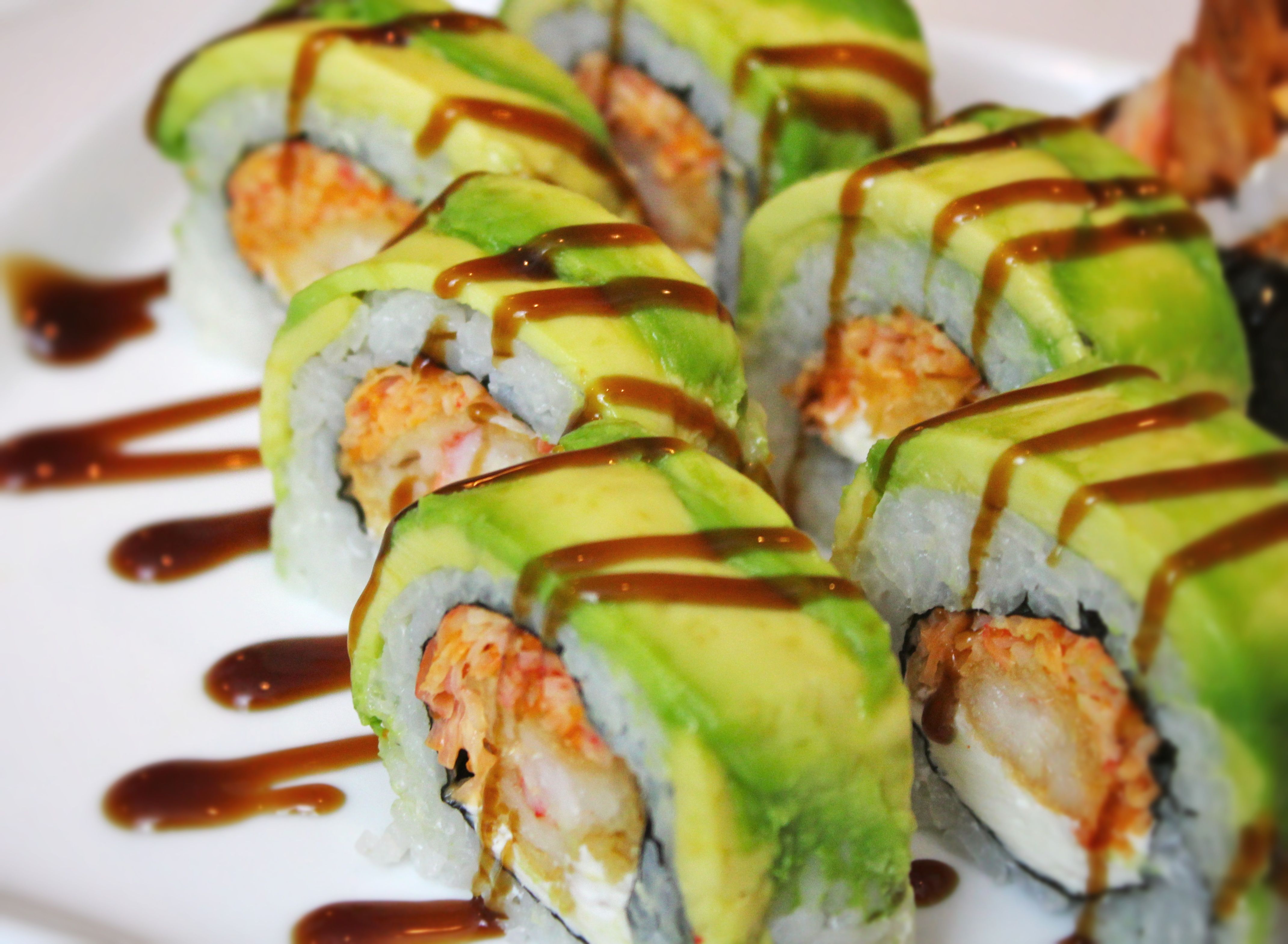 surimi & avocado. Topped with salmon sashimi, sliced avocado & wasabi ...