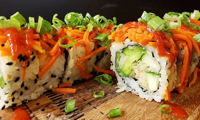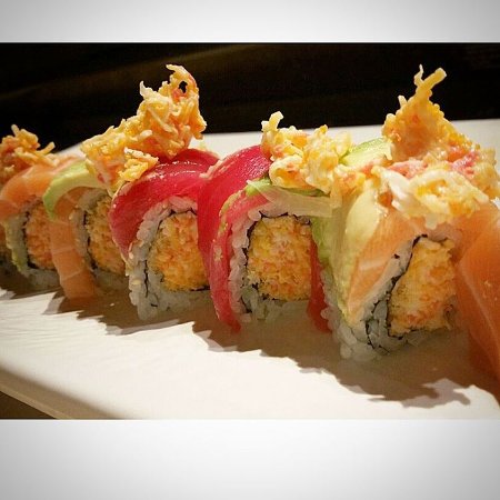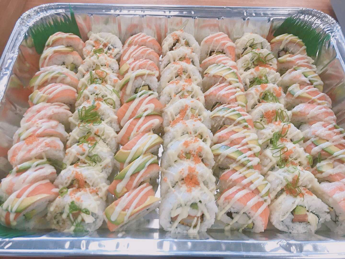 surimi, cucumber & avocado. Topped with teriyaki chicken, creamy tuna,...