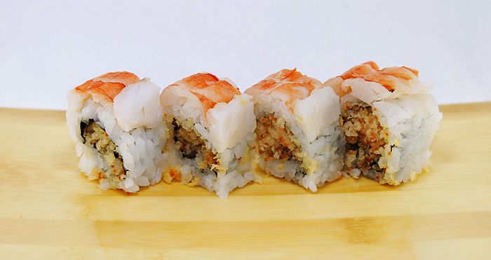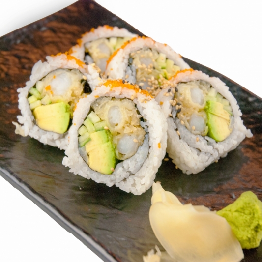 fried prawns, surimi, cucumber & avocado. Topped with masago, breadcru...