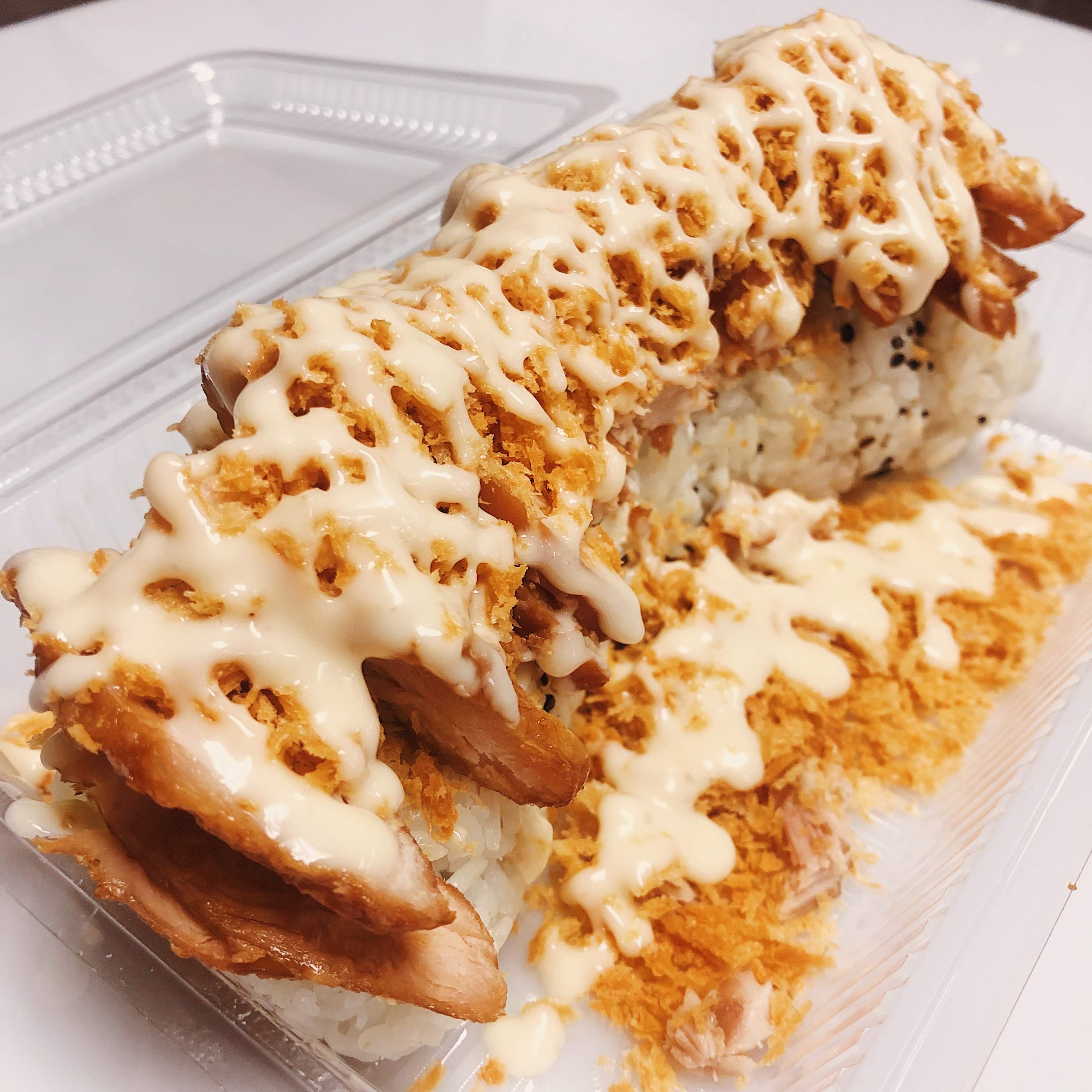 surimi, cucumber & avocado. Topped with teriyaki chicken, breadcrumbs & mayo *contains sesame seeds