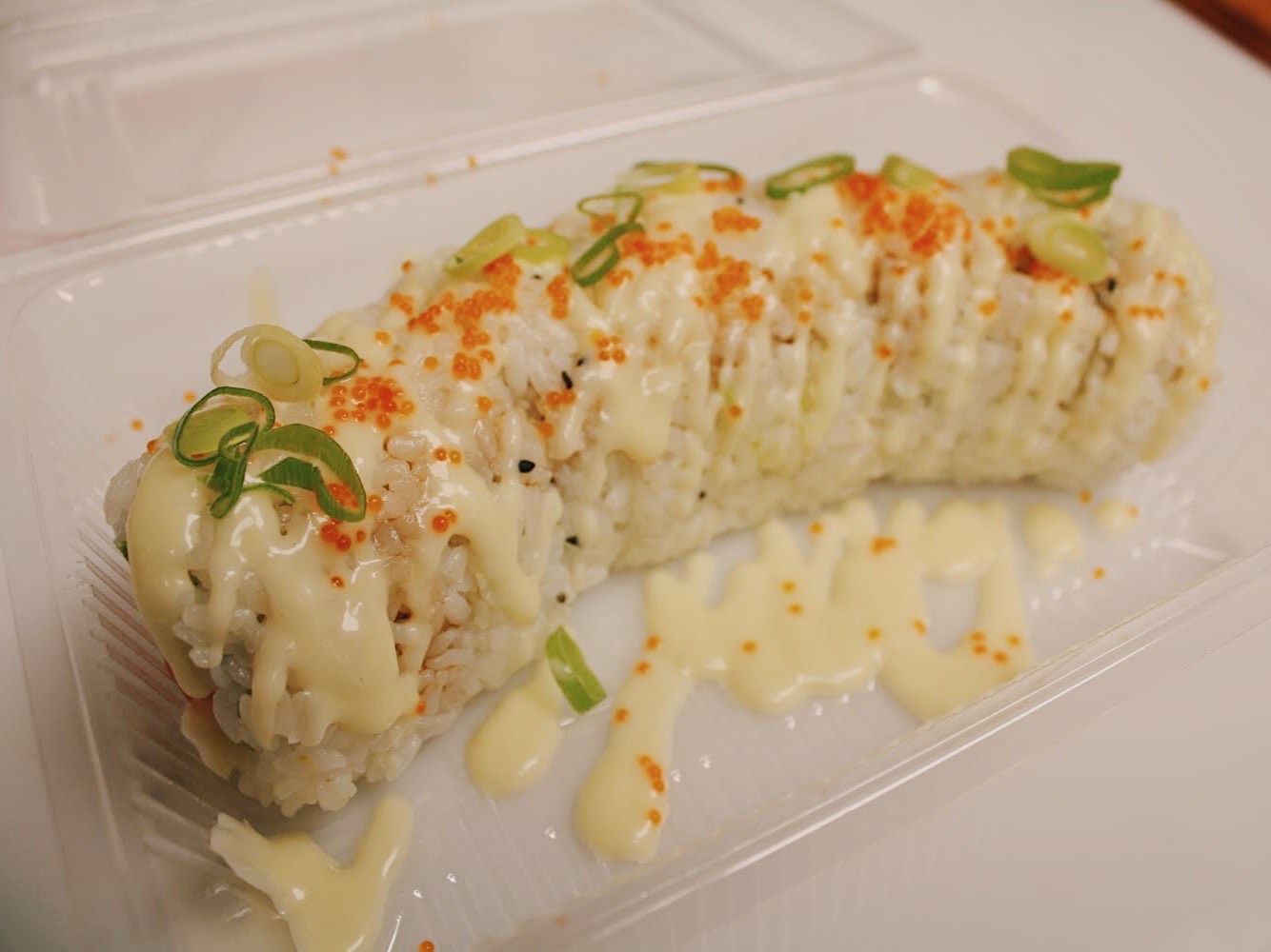 fresh salmon, cream cheese & avocado. Topped with spring onion, masago...