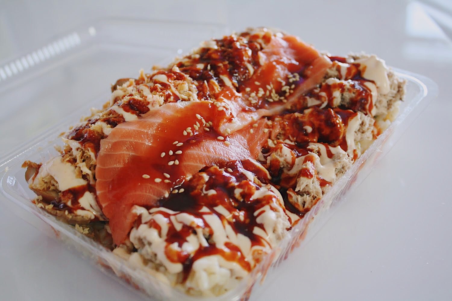 surimi, cucumber & avocado. Topped with teriyaki chicken, creamy tuna, salmon sashimi, wasabi mayo, hot sauce & spicy mayo *contains sesame seeds