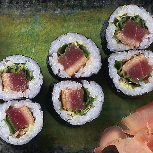 tuna & cucumber. Topped with teriyaki chicken, breadcrumbs & wasabi ma...