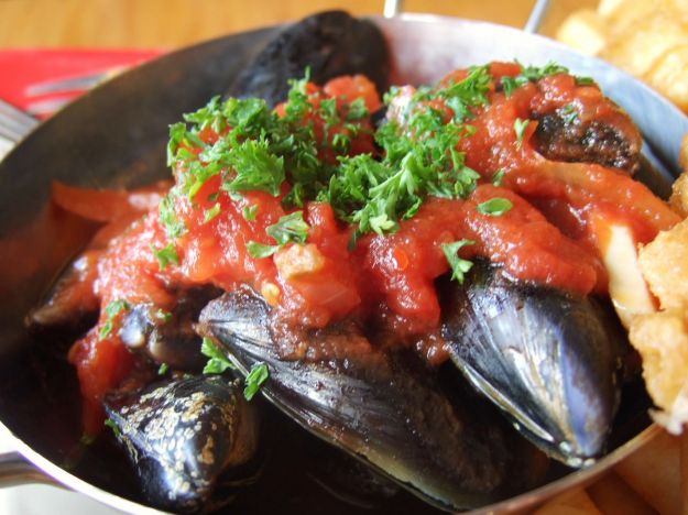 Green lipped mussels with garlic, lemon, white wine and napolitana sauce
