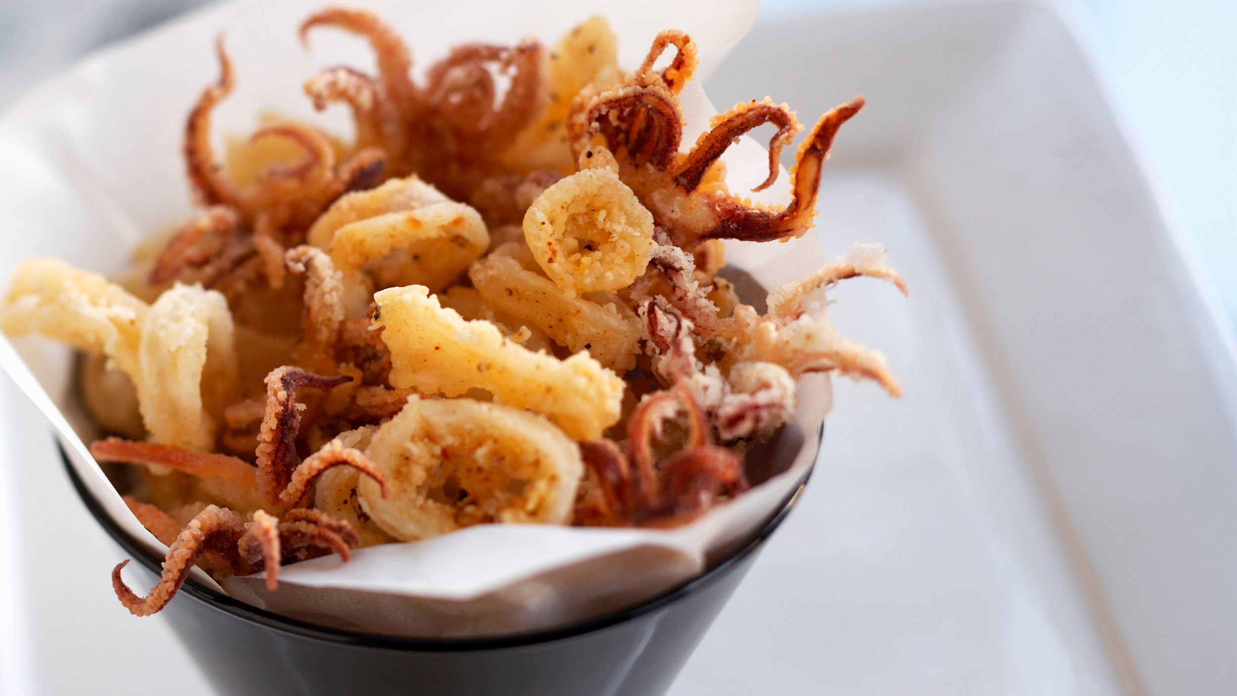 Squid rings crispy fried, served with garlic aioli, and salad greens