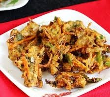 Chopped vegetables mildly spiced dipped in chickpea batter and deep fried