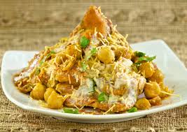Chana masala powder, fried green chilies, sev, yogurt, dried...