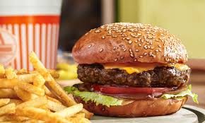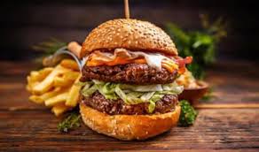 Beef burgers, tomato, red onion, oven chips, bread rolls
