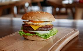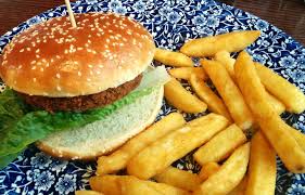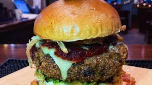 Veggie beef patty, lettuce, tomato, beetroot, gherkins, D’s homemade relish