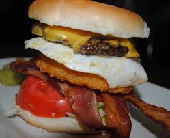 Beef burgers, tomato, red onion, oven chips, bread rolls...