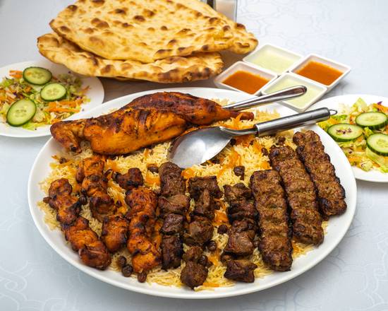 For five people. Three skewers of chicken, three skewers of lamb tikka, three skewers of minced lamb, three naans, salad and half BBQ chicken with rice.