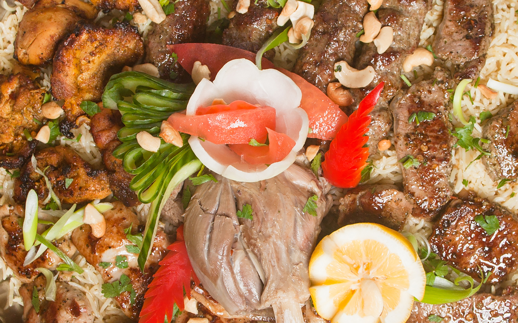 Variety of charcoal meat and chicken served with our signature rice, three naans, salad and traditional sauces