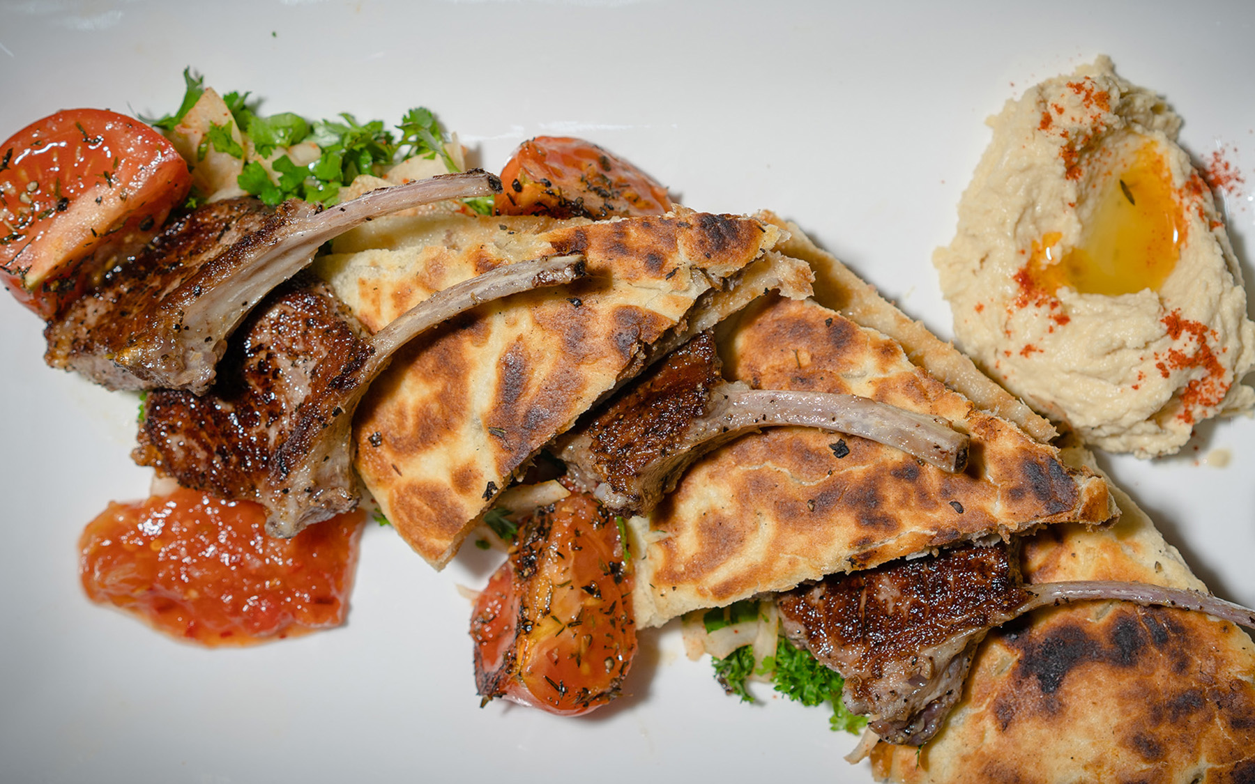 Bread with stuffed lamb mince served with grilled lamb cutlets and hummus