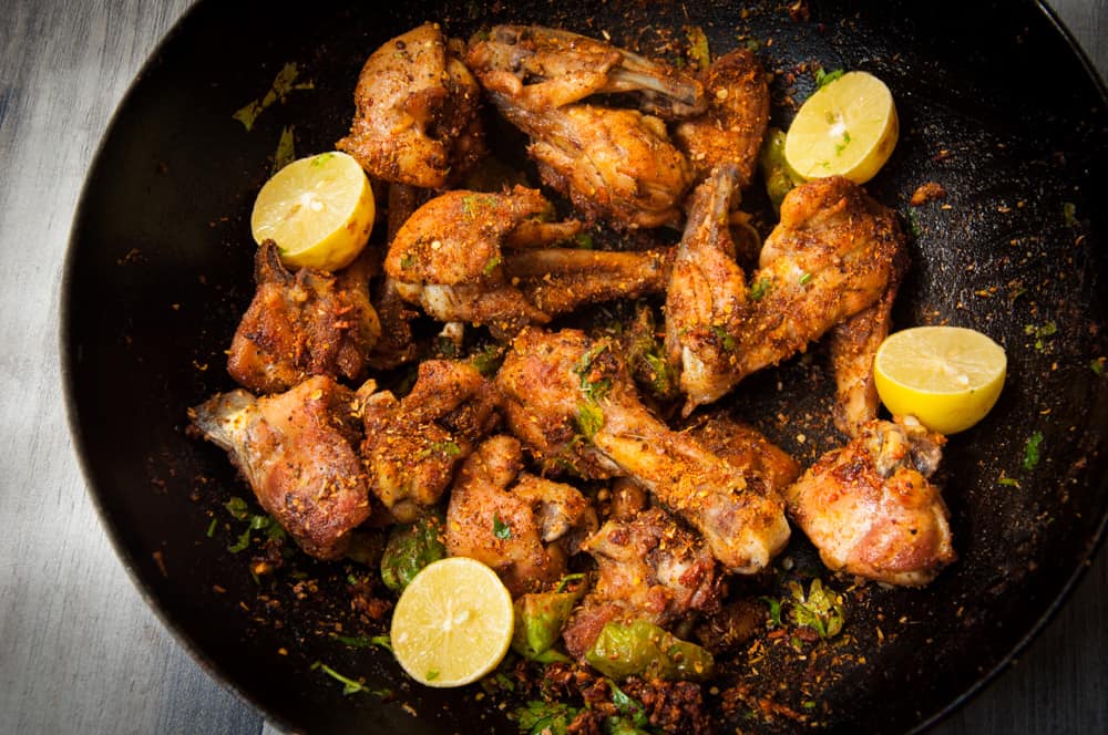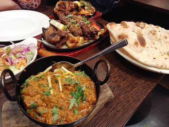 Boneless chicken cooked with chopped onions, green chilli, black pepper, bell pepper and yoghurt sauce served with naan breads and salad.