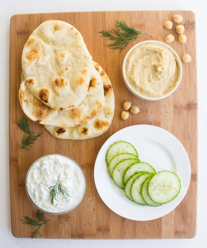 Roasted red pepper, tzatziki sauce, mini naan bread, mozzarella balls, avocado