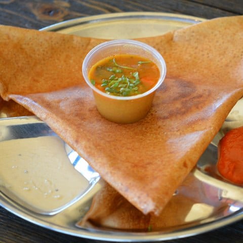 Tangy thin crepe stuffed with a thick tomato,potato based curry seasoned with chilli paste