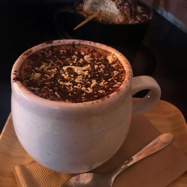 Premium 54% cocoa. Mayan spiced chocolate blend, orange zest, cinnamon & vanilla, topped with cream. 8.5
