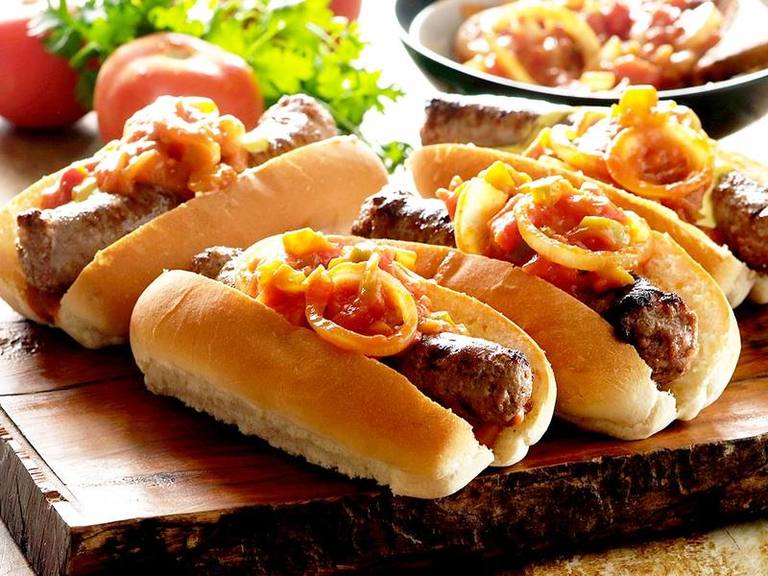 Hot dog rolls, boerewors, cherry tomatoes, caramelized onions, fresh t...