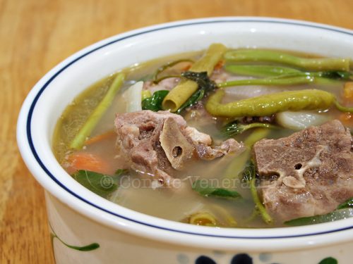 Pork sour soup. Pork belly on tamarind base soup with tomato, radish, and bok choy. Includes rice.