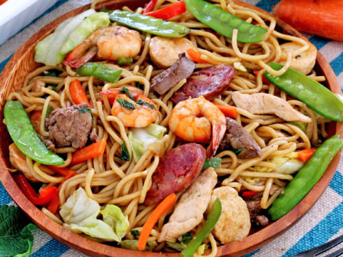 Mixed noodles. Stir fried of mixed egg noodles and rice noodles with pork, shrimp, cabbage, carrots, celery, and pepper.