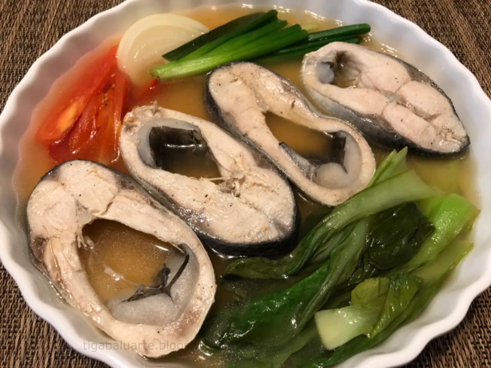 Milk fish sour soup. Boneless milk fish belly on tamarind base soup with tomato, radish, and bok choy. Includes rice.