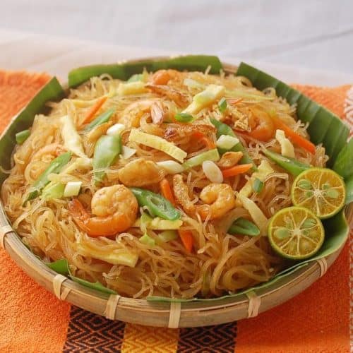 Thin rice noodle. Stir fried rice noodles mixed with pork, shrimp, cabbage, carrots, celery, and pepper.