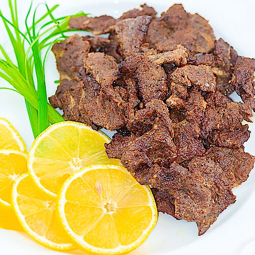 Sizzling pork. Roasted chopped pork meat mixed with liver, lemon, onions, and black peppercorns. Includes rice.