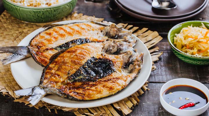 Boneless milk fish belly marinated with lemon and seasoning. With a gr...