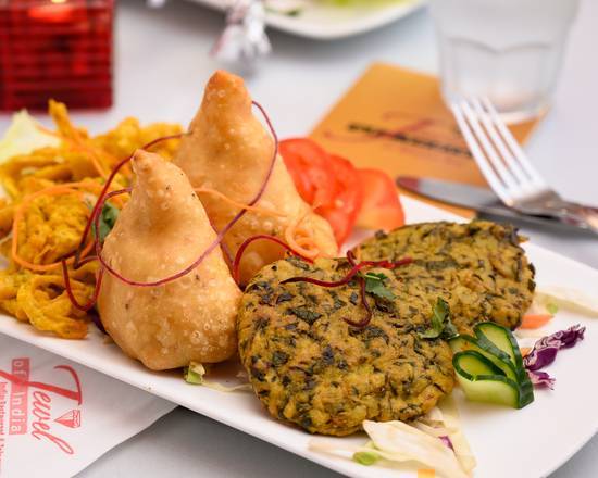 Selection of samosa, veg pakora, chicken tikka and seekh kebab.