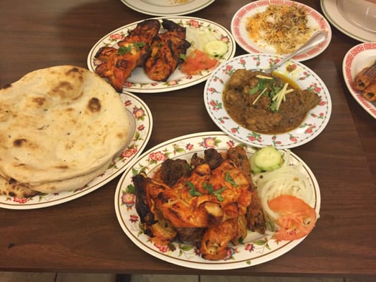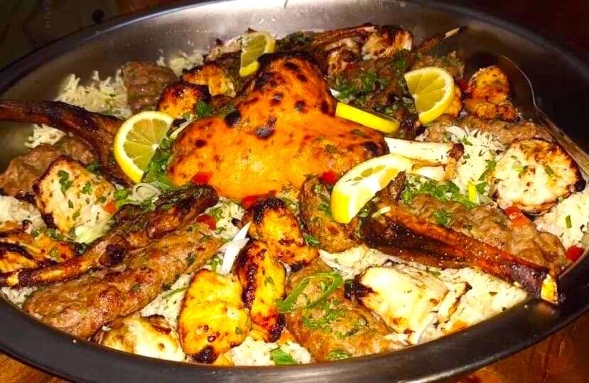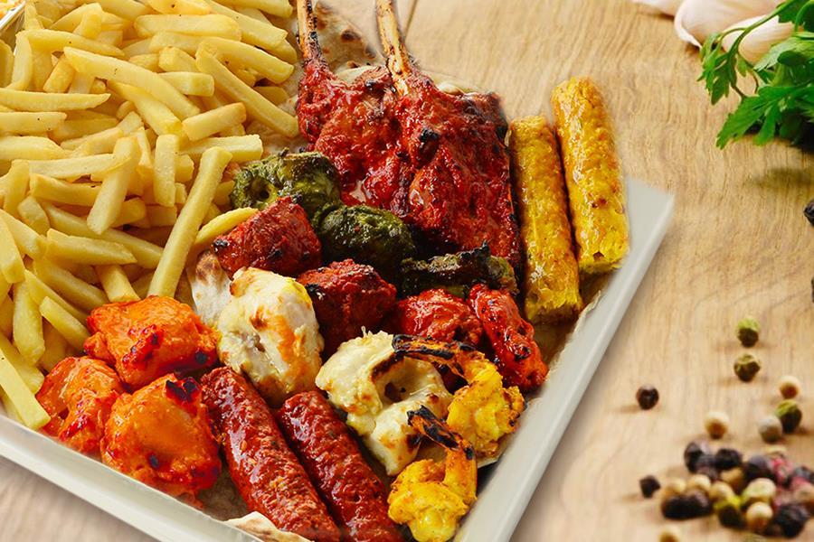 Combination of adana sheesh, chilli-cheese sheesh and chicken kebabs, lamb cutlets, charcoal chicken cubes, tandoori chicken cubes, grilled chicken wings served with our flavoured rice and traditional sauces