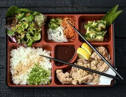 Chicken teriyaki, cucumber salad, apple, short grain rice, lettuce...