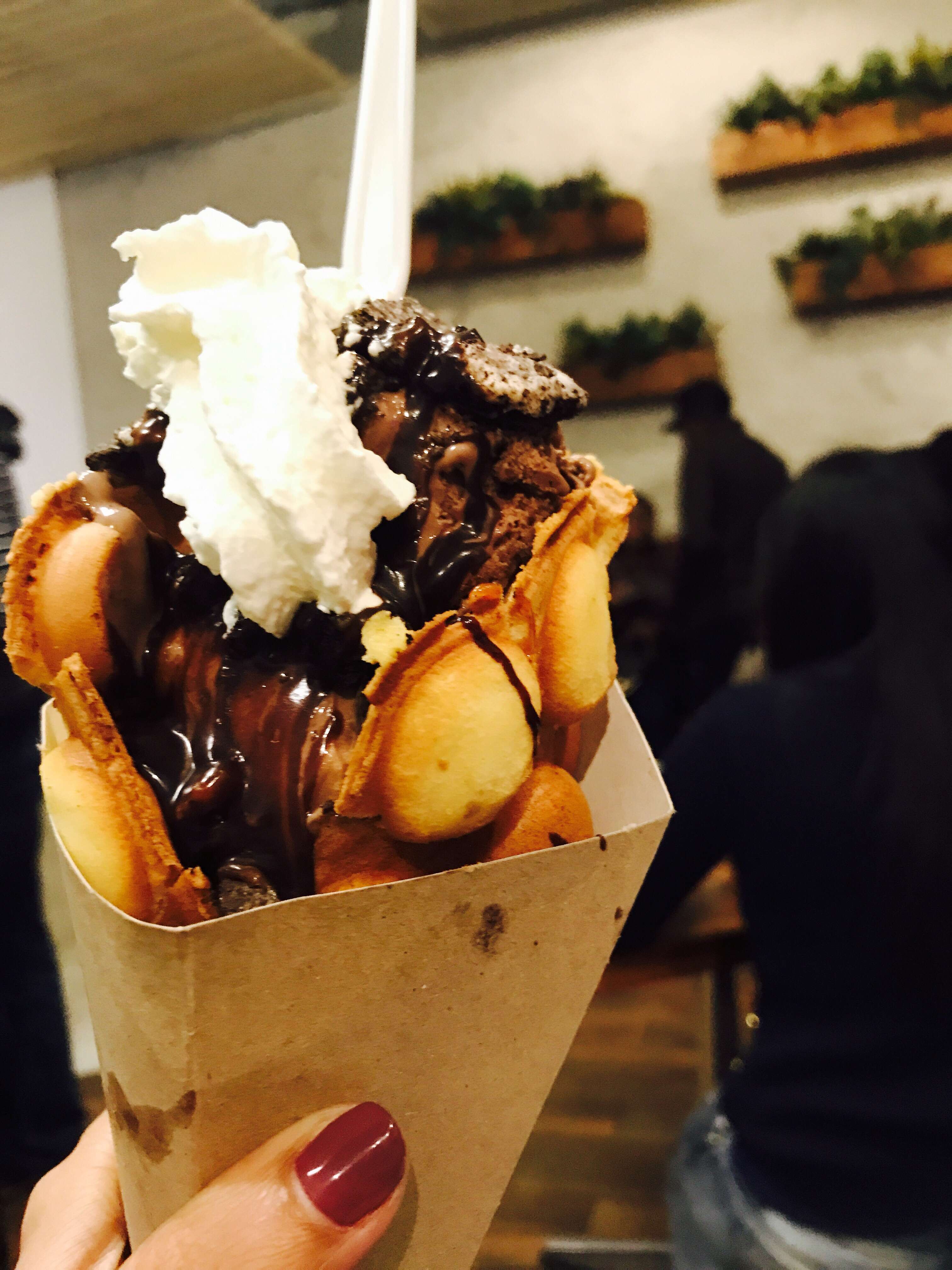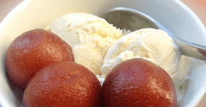 Gulab jamun, vanilla ice cream, fresh cream, mixed fruits