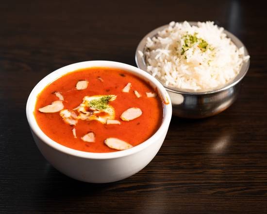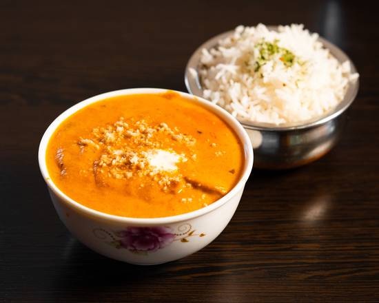 Marinated chicken grilled in clay oven and cooked in a creamy tomato sauce. Served with basmati rice.