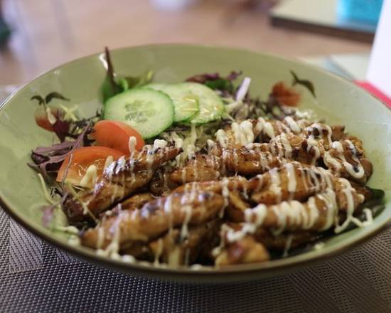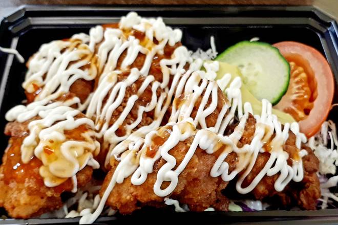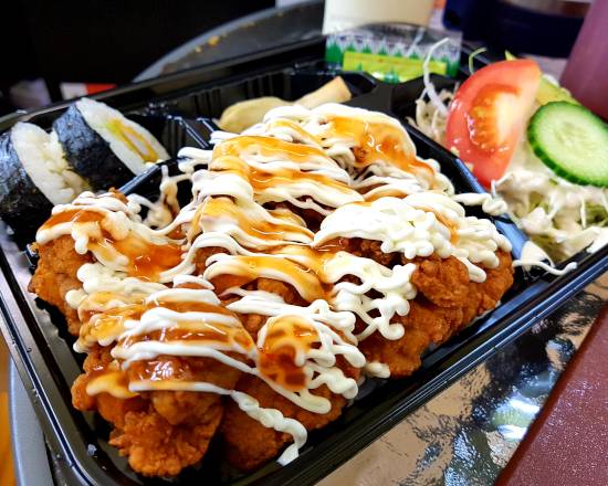 No Mayo on the top. Food in the photo was customised. 1.Comes with Fresh Salad n Rice 2.Photo shows Larger Size 3. Small Size is 550ml 4. Medium size is 850ml
