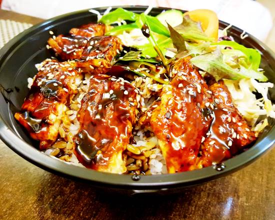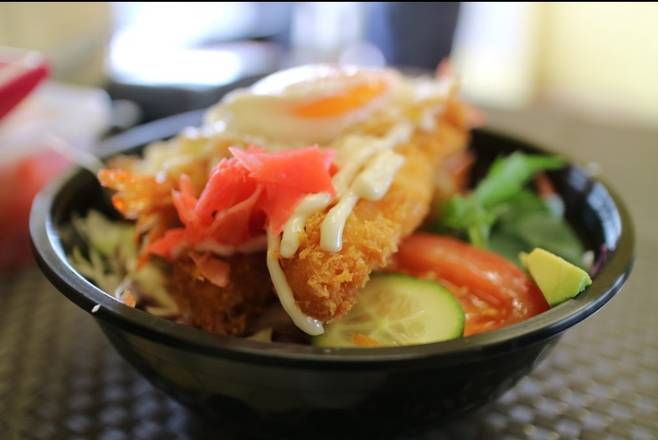 Prawn Tempura n Sunny Side up Egg Comes withe Japanese Mayo, Salad n Rice. 1.Comes with Fresh Salad n Rice 2.Photo shows Larger Size 3. Small Size is 550ml 4. Medium size is 850ml