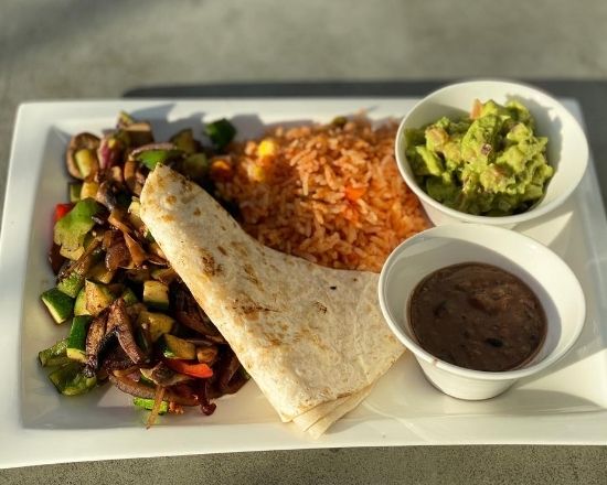 Marinated chicken in guajillo sauce sizzled to perfection on the grill with onion and capsicum, served with Mexican rice, beans, salsa and 4 flour tortillas. To prevent tortillas from getting soggy you will receive all the cooked ingredients to make yo