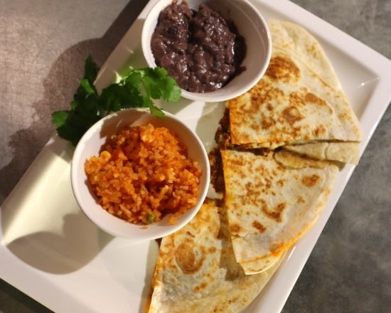 2 flour tortillas surrounding melted cheese with marinated pulled pork (cochinita) served with beans, Mexican rice, and chipotle chili mayo on the side
