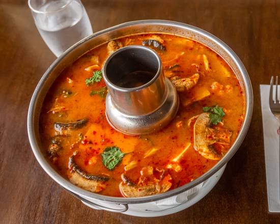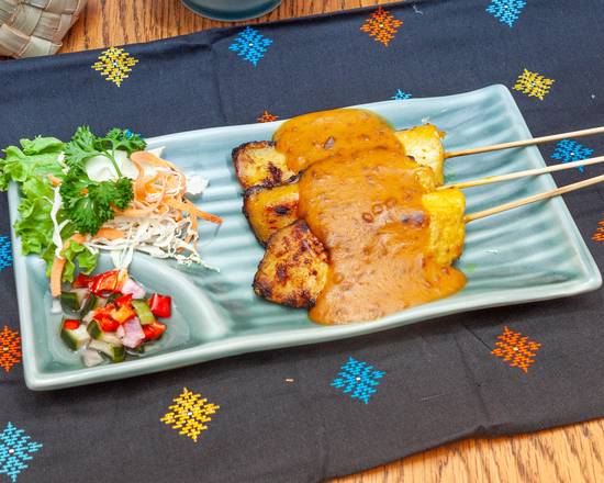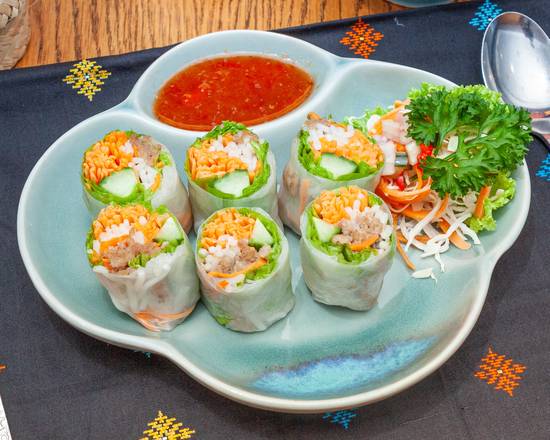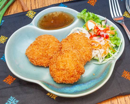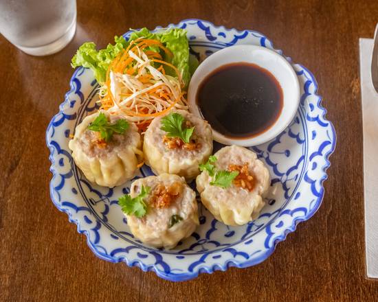 Thai of Chinese cuisine. Steamed minced pork marinated with water chestnuts and shiitake mushrooms. Wrapped in a thin pastry served with dipping sauce and crispy garlic.