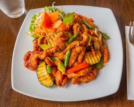 Medium. Chicken strips lightly coated with breadcrumbs. Stir fried in a medium spicy chilli sauce, carrots, onions, capsicums, green beans and courgettes.