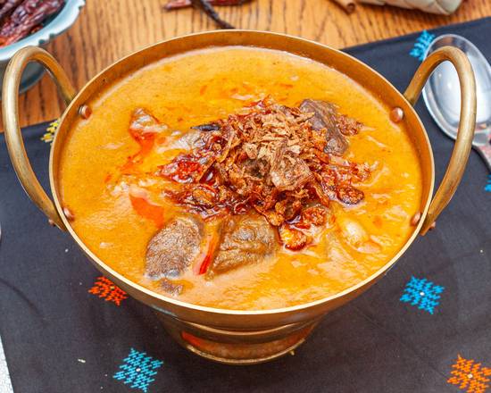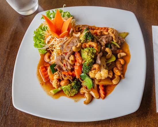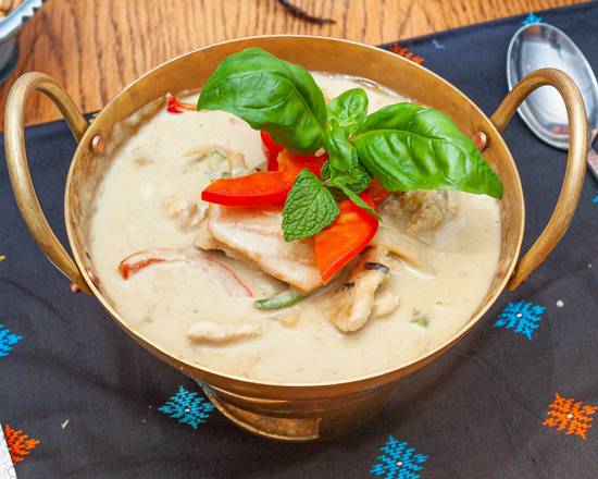 Thick medium hot curry. Royal Thai cuisine recipe. A thick and creamy curry sauce with your choice of meat. Sprinkled with crushed peanuts and kaffir lime leaves. No vegetables in this dish.