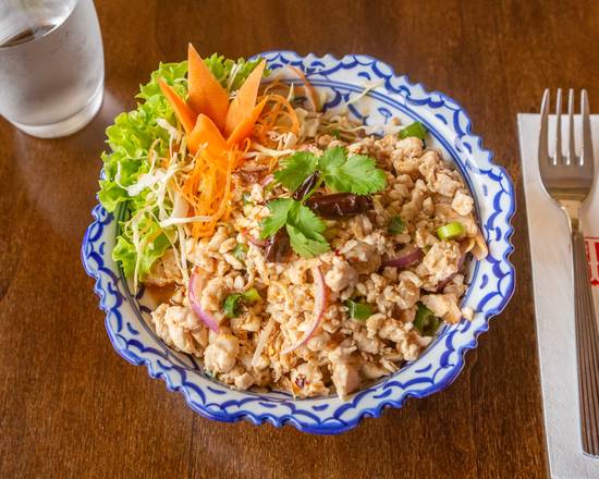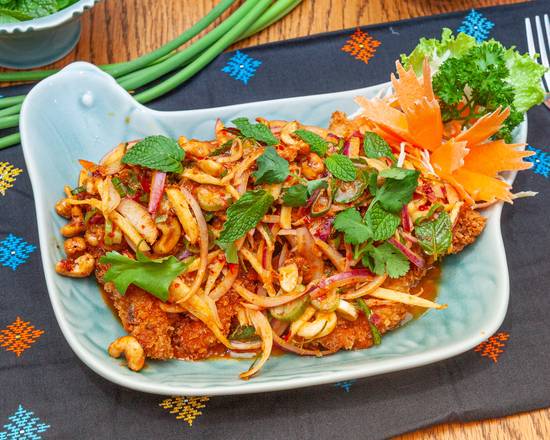 Crispy pork salad. Sliced marinated pork salad stir in spices, lemon juice, spring onions, onions with dressing, hot and sour chilli sauce and comes with Jasmine Rice.