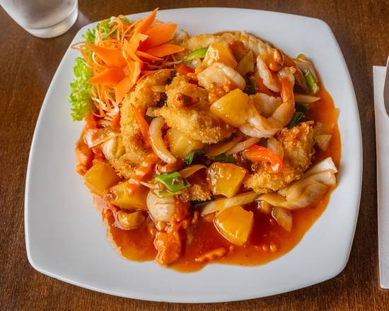 Mixed seafood dish, prawns, squid, fish fillets and scallops. Sizzled in Thai whiskey and tomato sauce with pineapple chunks, cashew nuts and vegetable.